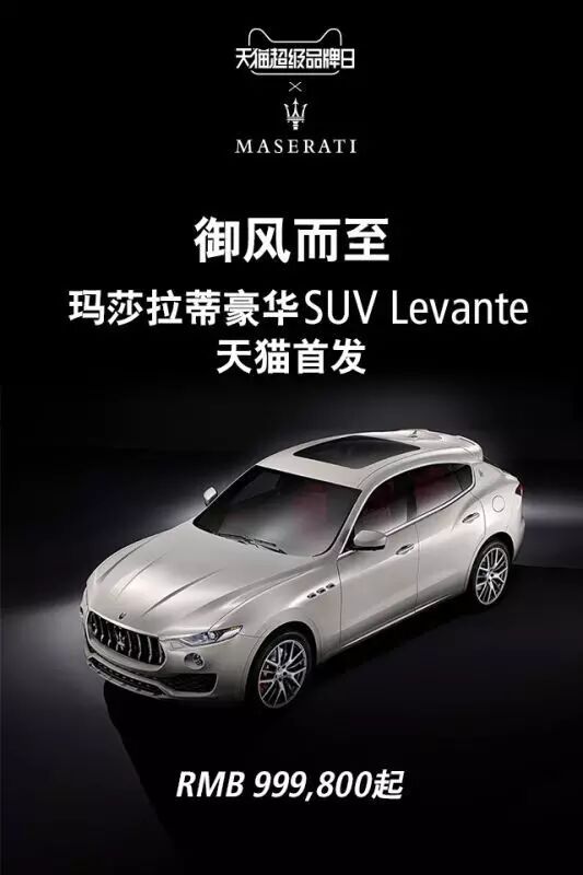 Levante天貓預(yù)售現(xiàn)已全面開啟,前100名預(yù)定者享優(yōu)先提車權(quán)。長按下圖二維碼,登陸并收藏瑪莎拉蒂天貓官方旗艦店,尊享天貓?zhí)貦?quán)!