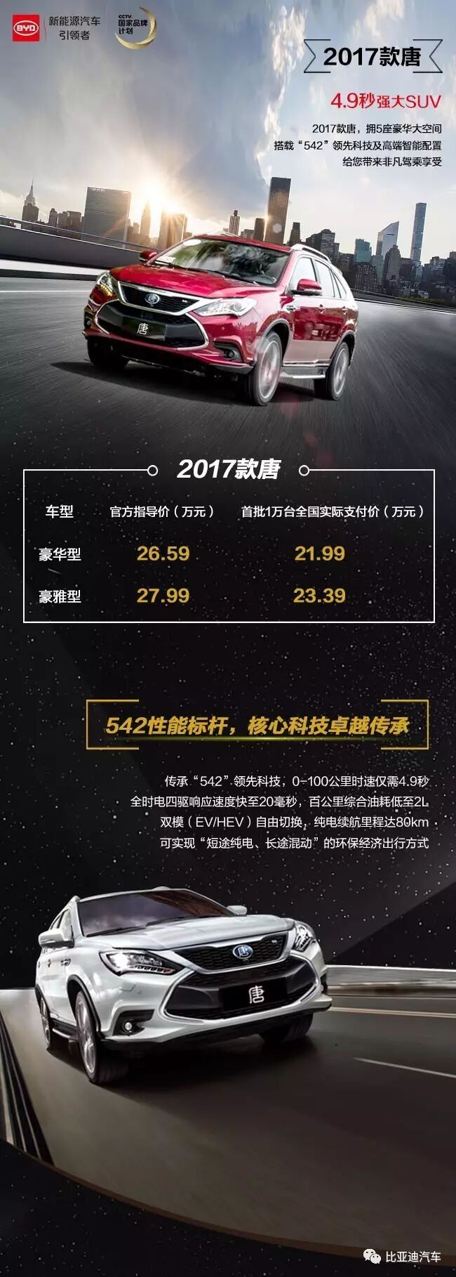 6月3日,比亞迪2017款唐在深港澳車展上市,“王朝”車系再添得力戰(zhàn)將!本次共推出全時(shí)四驅(qū)豪華型、全時(shí)四驅(qū)豪雅型兩款車型,官方指導(dǎo)價(jià)26.59萬元—27.99萬元。在享受3.6萬元政策支持(含國(guó)補(bǔ)、地補(bǔ)、比亞迪電動(dòng)未來基金)以及*高可節(jié)省約2.5萬元購(gòu)置稅、車船稅等后,比亞迪還額外給予首批1萬名用戶各1萬元的電費(fèi)。首批1萬臺(tái)2017款唐全國(guó)實(shí)際支付價(jià)為21.99-23.39萬元。
